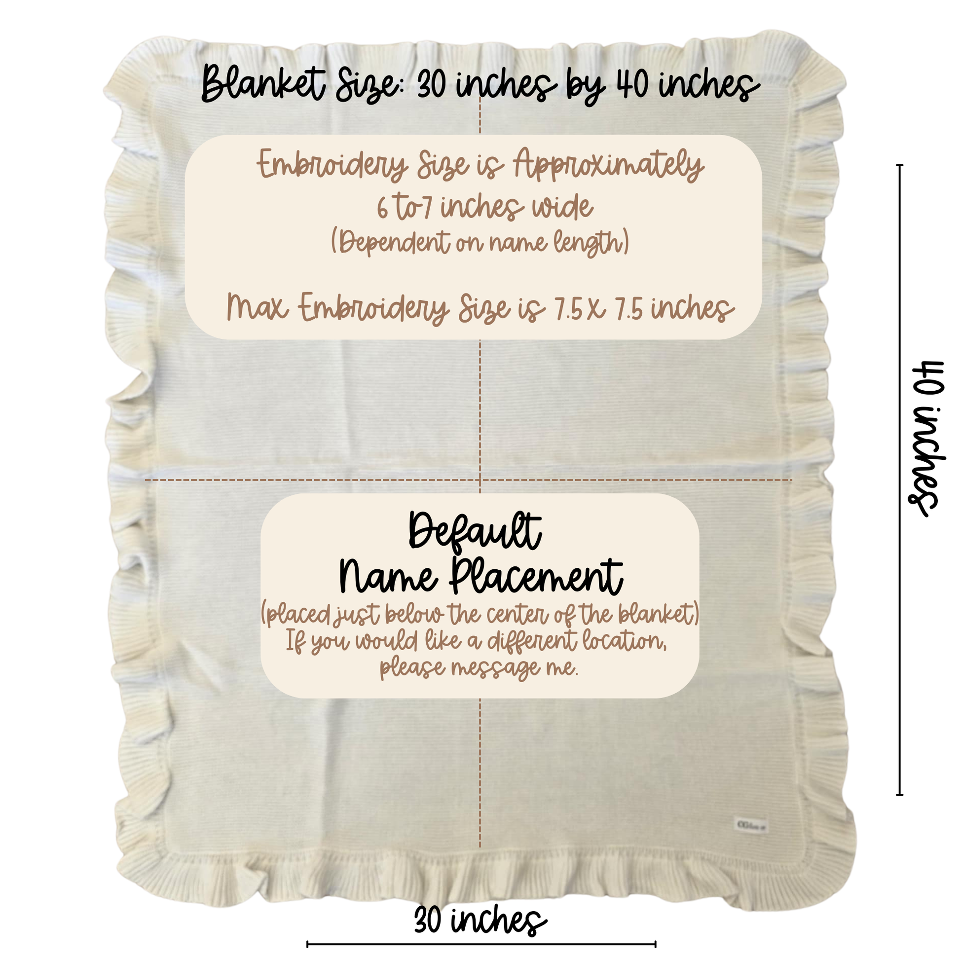 Choose any name or phrase you'd like to be embroidered. Approximate Embroidery size varies on name length, but is typically 6 inches across (max of 7 in x 7 in). Double names will be embroidered on 1 or 2 lines, depending on name length unless requested otherwise. Embroidery is placed below the center of the blanket on shorter side. If you wish to change this location, please specify.